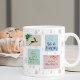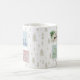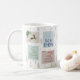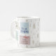 Navidades personalizados atragantan con sellos de correo vintage en azul verde rojo y beige decorados con un estag, cemento de pino, bayas de invierno y palabras festivas (Que nieve, Feliz Navidad y, Navidades de Joy Hope Peace Believe). La plantilla está configurada para personalizar uno de los sellos, a cada lado de la taza. Los sellos postales se sientan sobre un fondo de madera de pino navidad en beige natural.