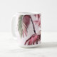 Das Bild präsentiert ein ätherisches Muster aus stilisierten Palmenblättern in sanften Rosé-, Grün- und Beigetönen, die sich geschickt auf einem hellen Hintergrund überlagern. Es vermittelt eine träumerische Ruhe und eine subtile tropische Eleganz, die Wärme und Exotik mit einer modernen Ästhetik verbindet.