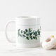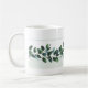 Extraordinarias hojas de eucalipto de color agua, verde oscuro y azul pálido, adornan una taza clásica recortada con una imagen de textura de menta de menta pastel.