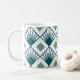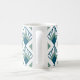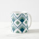 Esta taza tiene un diseño Art Déco de diamantes verde azulados con líneas diagonales y diamantes verdes de fondo marino en un campo blanco.