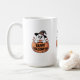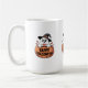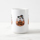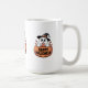 Feliz café Fantasma en la Cafetería de Halloween. Dentro de una calabaza gigante, un fantasma saca café bajo su gorra de bruja torcida. ¿Boo-hoo? Más como el brew-hoo! riñe, el bigote de espuma resplandece. Feliz Halloween, amigos de cafeína se quedan asustados y despiertos!