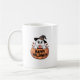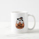 Feliz café Fantasma en la Cafetería de Halloween. Dentro de una calabaza gigante, un fantasma saca café bajo su gorra de bruja torcida. ¿Boo-hoo? Más como el brew-hoo! riñe, el bigote de espuma resplandece. Feliz Halloween, amigos de cafeína se quedan asustados y despiertos!