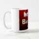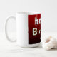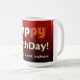 Esta taza de café feliz de cumpleaños brillante y alegre con fondo rojo y letras blancas y naranjas es un gran regalo de cumpleaños para los empleados.
