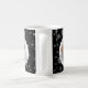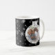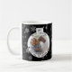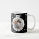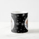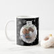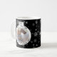 Feliz Navidad, Navidades de copos de nieve blancos y negros Ball Photo Mug. Diseño festivo lindo con una foto en la bola de Navidades con copos de nieve blancos sobre fondo negro. Añade tu foto y personalizar el texto en la taza.