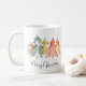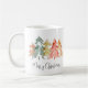 Sencilla y elegante taza de vacaciones para usted o para empacar un regalo de Navidades con una acuarela abstracta de pinos en verde sabio mudo, rojo, dorado y naranja y "Feliz Navidad" en un guión elegante.