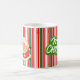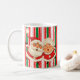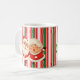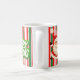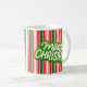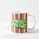 Un alegre Santa Claus con la Sra. Claus deseándole una Feliz Navidad sobre un tradicional fondo rayado rojo, verde y blanco.
