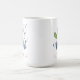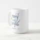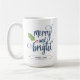 Celebra la temporada de fiestas con este alegre tazón de café de vacaciones con un simple ilustracion de una hoja verde y hueca con bayas rojas, elegante tipografía de escritura azul que dice, "Merry y Bright", y espacio para agregar texto de personalizable o un nombre. Esta encantadora taza será un gran regalo para los Navidades de su lista.