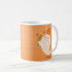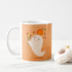 Un bonito fantasma sonríe alegremente mientras flota a través de un fondo naranja oscuro, sosteniendo un ramo de flores caídas como una embustera linterna de jack-o' sobre la cabeza del fantasma. Ilustracion original de Noël Snow