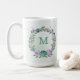 flores moradas azules románticas con algunas hojas verdes de taza de café botánico.