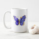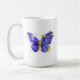 Joyería, azul, zafiro, mariposa floral brillante con ala decorada con flores azules y preciosas con hojas de oro sobre fondo blanco.