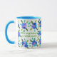 Una taza blanca muy bonita con un borde y una manija azules claros, adornados con una frontera de las flores azules frente y parte posterior de un collage de papel pintado a mano por Judy Adamson. ¡Añada su nombre al texto para hacer esto su muy poseen!