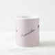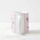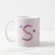 Esta hermosa y única taza de café o té por la mañana incluye una letra grande del primer monograma S. La letra S se crea con pétalos de flores rosados y cuentas moradas. Dos mariposas púrpura revolotean alrededor de la letra. La carta hecha a mano se muestra a ambos lados de esta taza con espacio en el centro para personalizar con tu nombre.