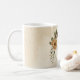 Taza de café única con flores rústicas románticas de terracota y hojas verdes.