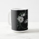 Hermosa taza de café con flores blancas románticas y hojas verdes sobre fondo negro. PARA OBTENER MÁS PRODUCTOS COINCIDENTES, haga clic en la colección superior o póngase en contacto conmigo.