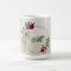 Taza de café única y hermosa con flores rojas y amarillas pálidas románticas y hojas verdes.