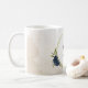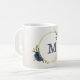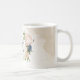 Hermosa taza de café con flores rosa beis y navy y hojas verdes.