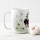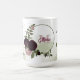 Mug de café botánico con hermosas y románticas flores rosadas y burdeos con hojas verdes.