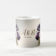Taza de café elegante dorada con flores rosadas púrpura. Diseño único, hermoso y elegante. Fácil de personalizar. El estilo, tamaño y colores de la fuente pueden ser cambiados. Artículos a juego disponibles.
