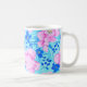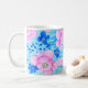 Este colorido diseño presenta hermosas flores rosas y azules vibrantes sobre un fondo azul claro.
