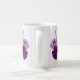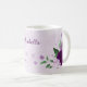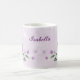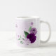 Hermosa taza de café romántica con flores púrpuras y algunas hojas verdes .
