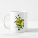 un diseño de acuarela tradicional de frutos de limón que crecen de una rama arbórea con colores verdes y amarillos en una taza de café