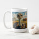 A cute personalized coffee mug with an impasto close up of an ostrich on a ranch.