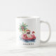 Gracioso Santa Claus Tropical Beach Navidades Mug. Esta divertida taza navideña cuenta con un Papá Noel relajado con gafas de sol, flotando en el océano en una flotación rosa de flamingo. Una palmera festiva decorada con adornos y suaves olas completan el paisaje tropical. El diseño está impreso a ambos lados de la taza, con espacio en la parte inferior para personalizarla con un nombre o una frase corta de su elección. El estilo acuático de la playa agrega una vibración alegre y soleada, lo que lo hace un gran regalo para cualquiera que viva en un clima cálido como Florida, Hawaii o Bahamas —o para cualquiera que ame una toma tropical de Navidades.