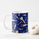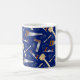 Mug divertida para los entusiastas del DIY, carpinteros y hombres de mano. Azul oscuro con herramientas de carpintería estampadas sobre él.