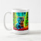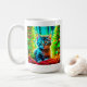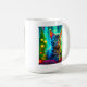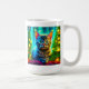 Los gatitos de doble cara, lindos y grises, sentados frente a la taza de café iluminada de árboles de Navidad.
