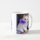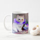 ¡Coffee Mug con un gatito blanco magnífico! Un gatito mullido lleva un collar de flores moradas. Un tazón azul de flores blancas y moradas se sienta a la derecha. Un regalo maravilloso para los amantes del gato y del arte victoriano.