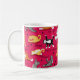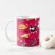 Diviértase bebiendo su bebida de esta taza con gatos en varias poses de yoga como "gato bajista" "guerrero Tomcat" con este tierno y caprichoso arte original de Phyllis Dobbs. El fondo es rojo con negro, blanco, naranja, tabby y gatitos amarillos. Las palabras humorísticas dicen la pose del yoga para el gato. Este diseño también está disponible con un fondo turquesa.
