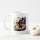 Un gatito negro vestido de bruja vagando en una espeluznante noche de Halloween. Estilo personalizado con ojos brillantes, casa embrujada y vibraciones fantasmas juguetonas. Perfecto para los amantes del gato y los aficionados al arte de Halloween.