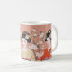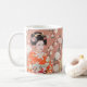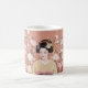 Esta taza de café muestra hermosas obras de arte de tres geishas japoneses en un fondo rosado.