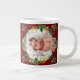 "Primera Navidad como abuela Foto Holly Pine Cone Giant Coffee Mug." Precioso regalo de honor para la nueva abuela a atesorar para siempre. Incluye una foto de su precioso nieto nuevo y su mensaje personalizado con el nombre del bebé. Todo el arte fue pintado con acuarela por la artista y diseñadora con licencia internacional Audrey Jeanne Roberts, copyright.