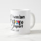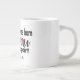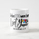 Jumbo Algunos días, una taza de jue de tamaño normal no sirve. Cuando necesites un toque extra de cafeína, saca esta taza gigante de café de Zazzle. Tiene capacidad suficiente para una medida Venti (20 onzas). ¡Y también la pudes usar para tomar sopa, cereales o incluso helado! Esta taza gigante cuenta con un asa en forma de "C" para mayor comodidad. Dimensiones: Altura: 4,5" Diámetro: 3,9" Capacidad: 20 onzas Seguridad de microondas y lavavajillas Construcción fuerte, cerámica Cumple o excede los requisitos de la FDA para la seguridad de los alimentos y bebidas Impreso a petición en Reno, NV Designer Tip: Para garantizar la impresión de máxima calidad, tenga en cuenta que el área de diseño de personalizable de este producto mide 4" de alto x 10,5" de ancho + Más