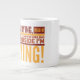 Jumbo Algunos días, una taza de jue de tamaño normal no sirve. Cuando necesites un toque extra de cafeína, saca esta taza gigante de café de Zazzle. Tiene capacidad suficiente para una medida Venti (20 onzas). ¡Y también la pudes usar para tomar sopa, cereales o incluso helado! Esta taza gigante cuenta con un asa en forma de "C" para mayor comodidad. Dimensiones: Altura: 4,5" Diámetro: 3,9" Capacidad: 20 onzas Caja fuerte de microondas y lavavajillas Construcción fuerte, cerámica Cumple o excede los requisitos de la FDA para la seguridad de los alimentos y bebidas Impresión a petición en Reno, NV Designer Tip: Para garantizar la impresión de máxima calidad, tenga en cuenta que el área de diseño de personalizable de este producto mide 4" de alto x 10,5" de ancho