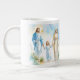Un retrato delicado de la Sagrada Familia, con Santa María, el Niño Jesús y San José. Unidos por la mano, caminan juntos hacia nosotros para llevarnos de la mano y caminar con ellos en Paz, Esperanza y Fe. Gráfico computacional con pintura, efecto acuarela.