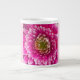 Una flor rosa brillante cubre la parte delantera de esta taza.