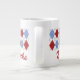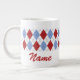 Esto es de 20 oz. (onza) jumbo de tamaño tiene un "Mis viejos zócalos" que dice escrito en rojo oscuro y un campo de texto de personalizable para un nombre. El diseño presenta un motivo de polla de punto rojo y azul oscuro. Un regalo perfecto para usted o para cualquier bebedor de café.