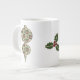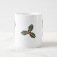 Cuatro plazas de color verde y marrón están adornadas con adornos rojos adornados con copos de nieve blancos y verde y con bayas rojas. El punzonado blanco aporta un toque decorativo, dando a la tónica repetida la apariencia de una colcha, creando un ambiente muy acogedor para las vacaciones de los Navidades. La forma de un ornamento de lágrima crea una máscara para que el diseño añada un toque estacional final. Esta taza está disponible en tamaños y estilos de jumbo, espresso y porcelana ósea.