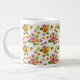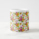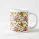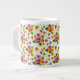 Esta encantadora taza presenta un pequeño patrón de flores pansy rosadas y amarillas.