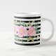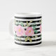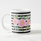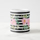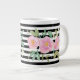 Disfrute de su bebida caliente favorita en esta hermosa jarra con flores rosas en color agua y rayas blancas y negras.