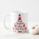 Enjoy a cup of holiday cheer with this unique Gnome and Gingerbread Christmas Tree Mug! The design forms a festive tree shape, composed of the warm greeting, "Merry Christmas and Happy New Year," along with cute elements like gingerbread men and stars. Several adorable Nordic Gnomes (Tomte) are integrated into the design, including one standing on top and others resting below. This mug is perfect for enjoying your favorite seasonal beverage, from spiced tea to hot cocoa, throughout the entire winter season. It makes a wonderful, one-of-a-kind Holiday Gift or Stocking Stuffer for anyone who loves cute gnomes and unique Christmas imagery.