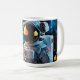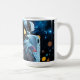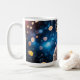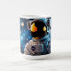 Ceramic mug with a bold close-up astronaut, mirrored gold visor and crisp suit details, floating against a bokeh blue outer-space background.