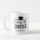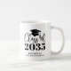 Esta elegante y moderna taza de graduación presenta un clásico gorro de graduación y borla en la parte superior, con "Clase de" en elegante letra manuscrita justo debajo, seguido del año de la clase, que se puede personalizar a "Clase de 2026" o cualquier año. Debajo del año, el nombre del graduado y la escuela se muestran en fuentes serif atemporales para un aspecto pulido y equilibrado.