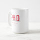 Una gran taza de doctorado que incluye el nombre del graduado, el campo de estudio y la fecha de graduación. La taza incluye el nombre en un tipo de letra de escritura a mano y un diseño rojo y negro. Es grandioso como un gran favor o un favor partidario. Simplemente agrega la información del graduado, agrega esta taza a tu carrito, y felicitaciones por este importante hito! Graduado Keepsake Red Nombre Negro PhD Gran Café Mug Diseño de vacaciones | ©Melissa Patton - Diseñador