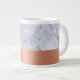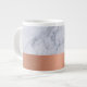 Esta taza de café grande tiene un diseño de mármol blanco y negro en ella con una tira de cobre del acento alrededor de la base.