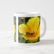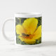 Esta impresionante taza muestra una detallada fotografía de una magnífica mosca a rayas amarillas y negras arrastrándose por una amapola californiana amarilla buscando néctar.