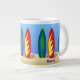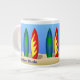 Este tazón de café con temática de surf tiene tablas de surf coloridas y "Surfer Dude" de un lado y tu nombre personalizado del otro lado. Gran idea de regalo para un surfista.