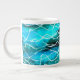 Una llamativa taza Jumbo-Sized Mug para el café o la sopa, con un diseño "Waves" abstracto de color azul turquesa, verde oscuro, blanco y negro, procedente de una acuarela de Judy Adamson. También se ofrecen bolsitas de té, cántaros y varios tazas.